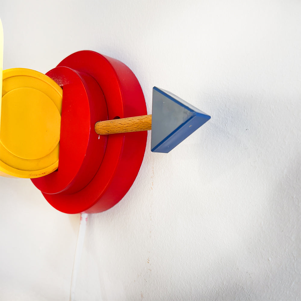 Weißer Kunststoffschirm und Holzsockel, rot, gelb und blau lackiert.