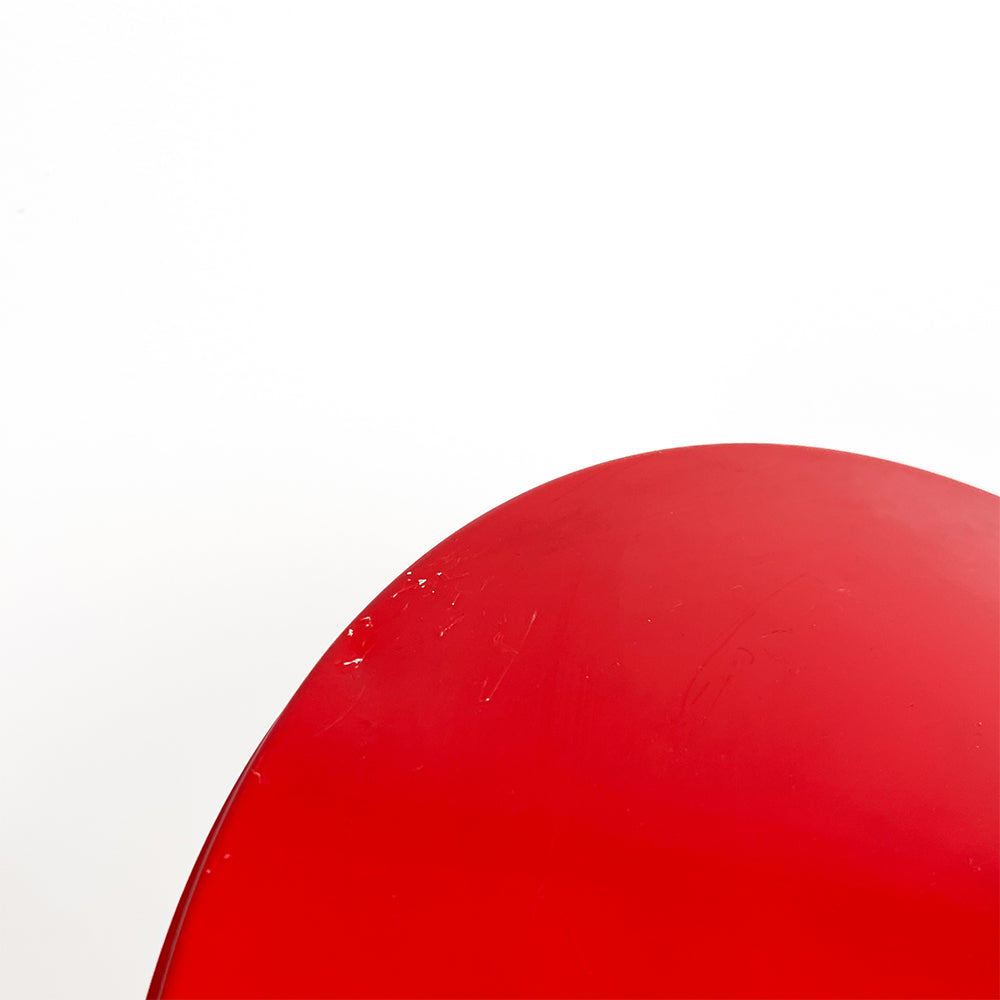 Rot lackiertes Metall. Der Schirm weist einige Kratzer auf.