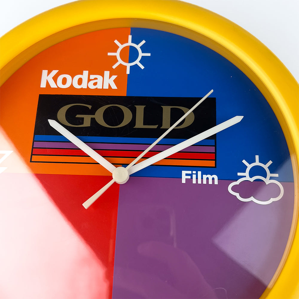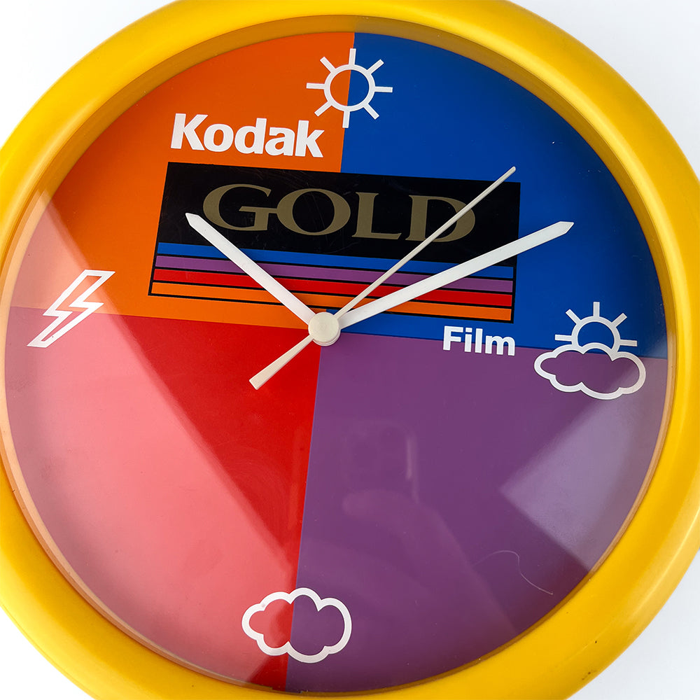 Kodak Promotional Wall Clock, 1980s Yellow plastic, dial with Kodak advertising image. Measurements: 25 cm in diameter