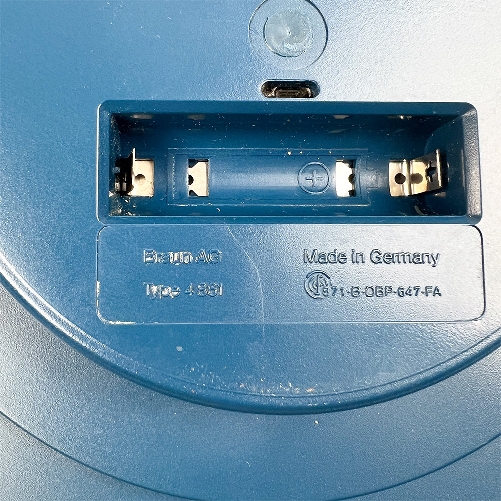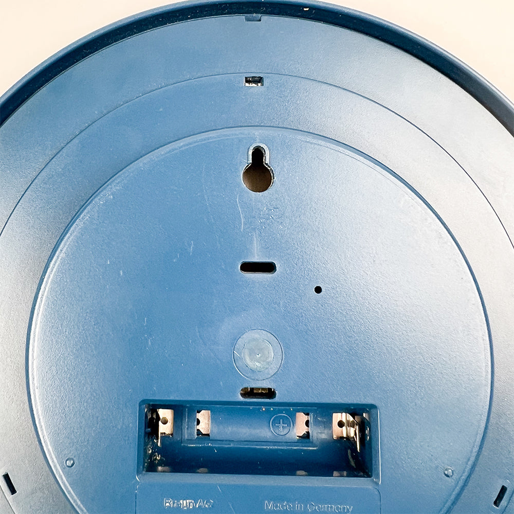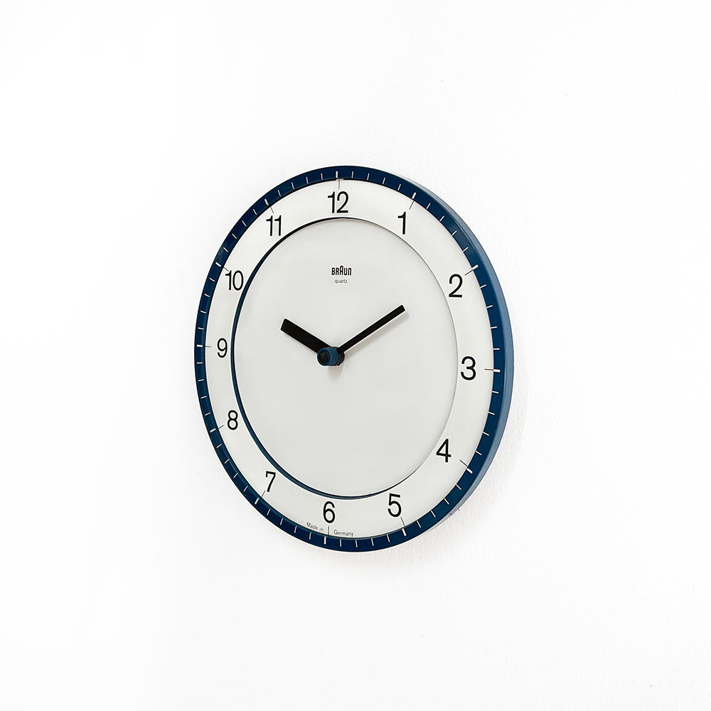 ディートリッヒ・ルブスがブラウンのために1982年にデザインした壁掛け時計4861。 側面と背面は青いプラスチック、前面はメタリックグレー。 直径20cm。状態良好。単3電池1本で動作します。